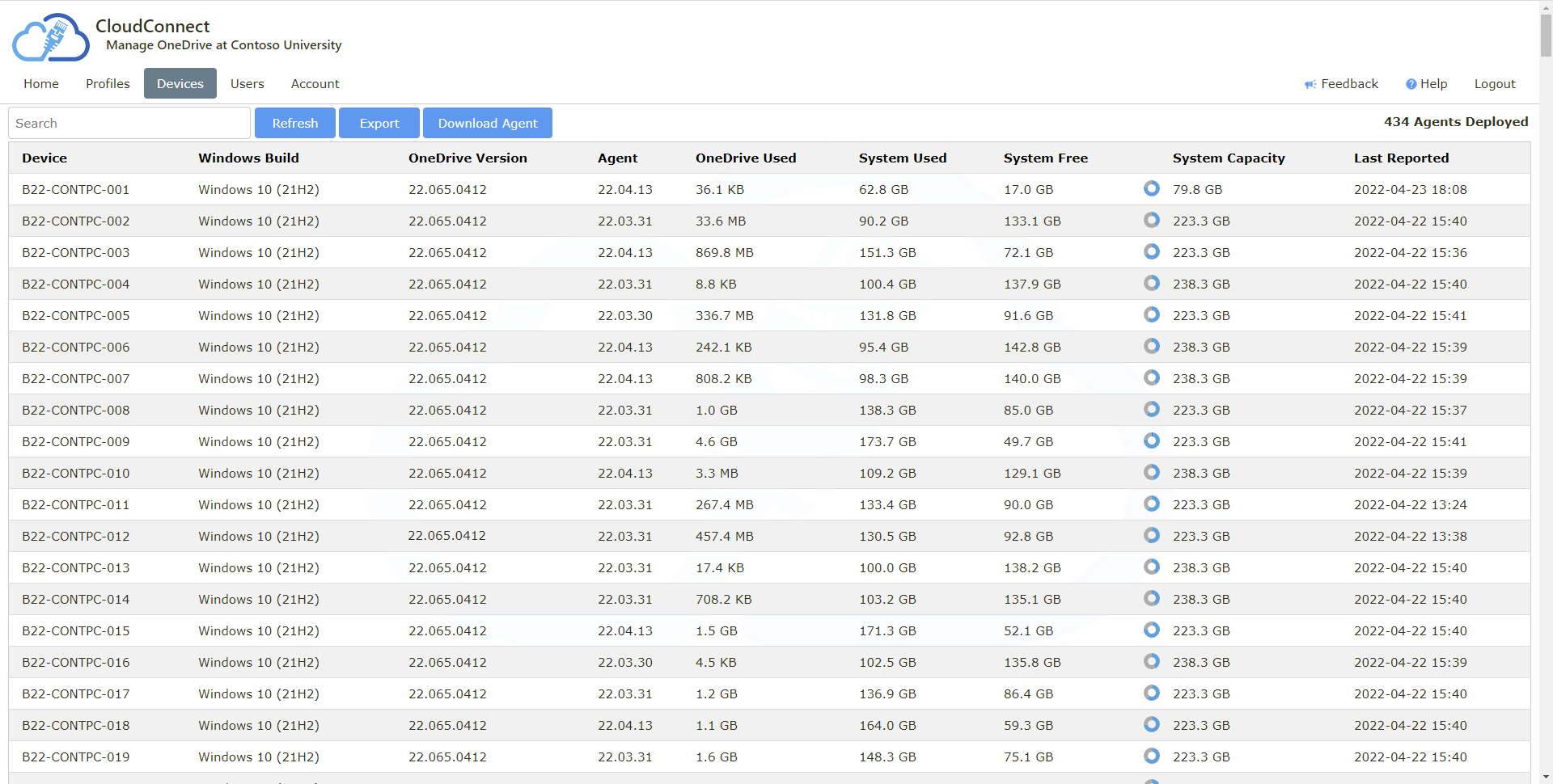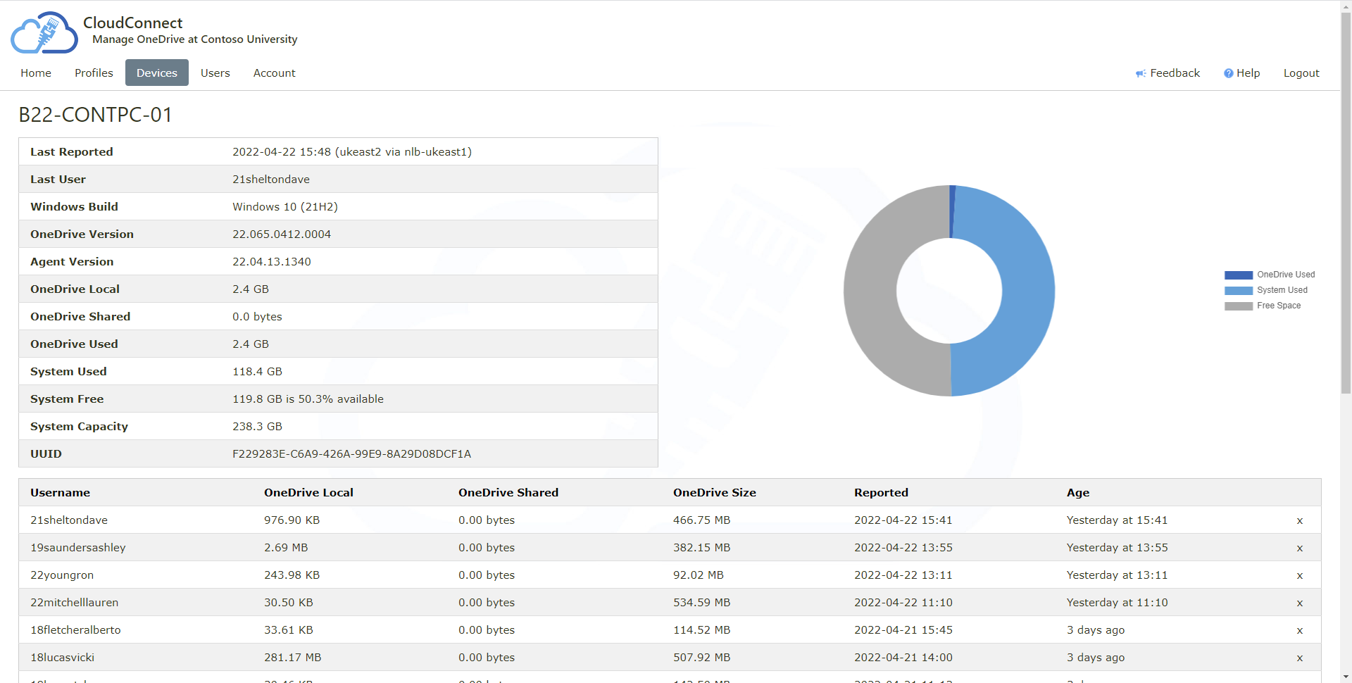 Disk space usage for each user and device is reported centrally