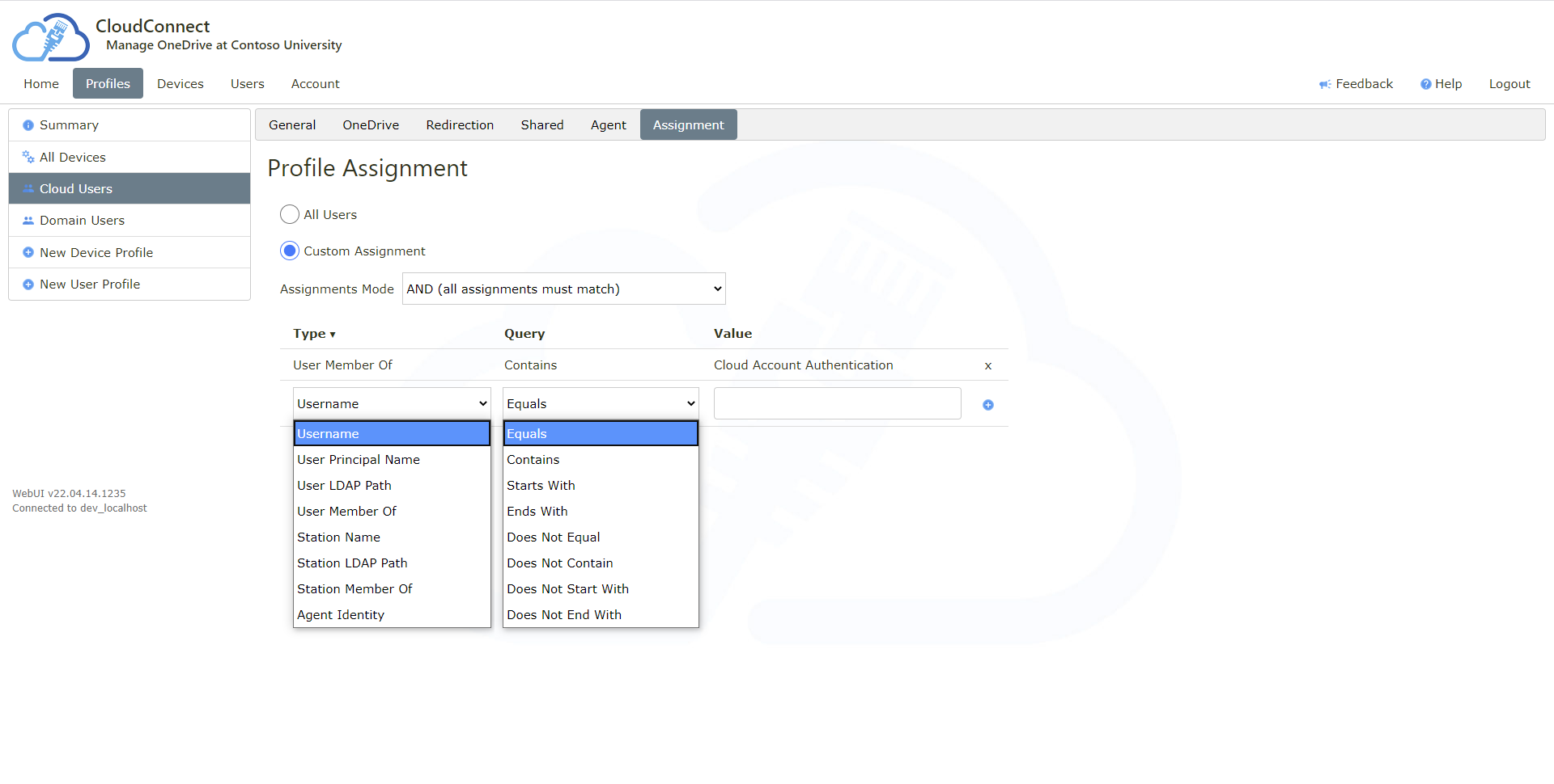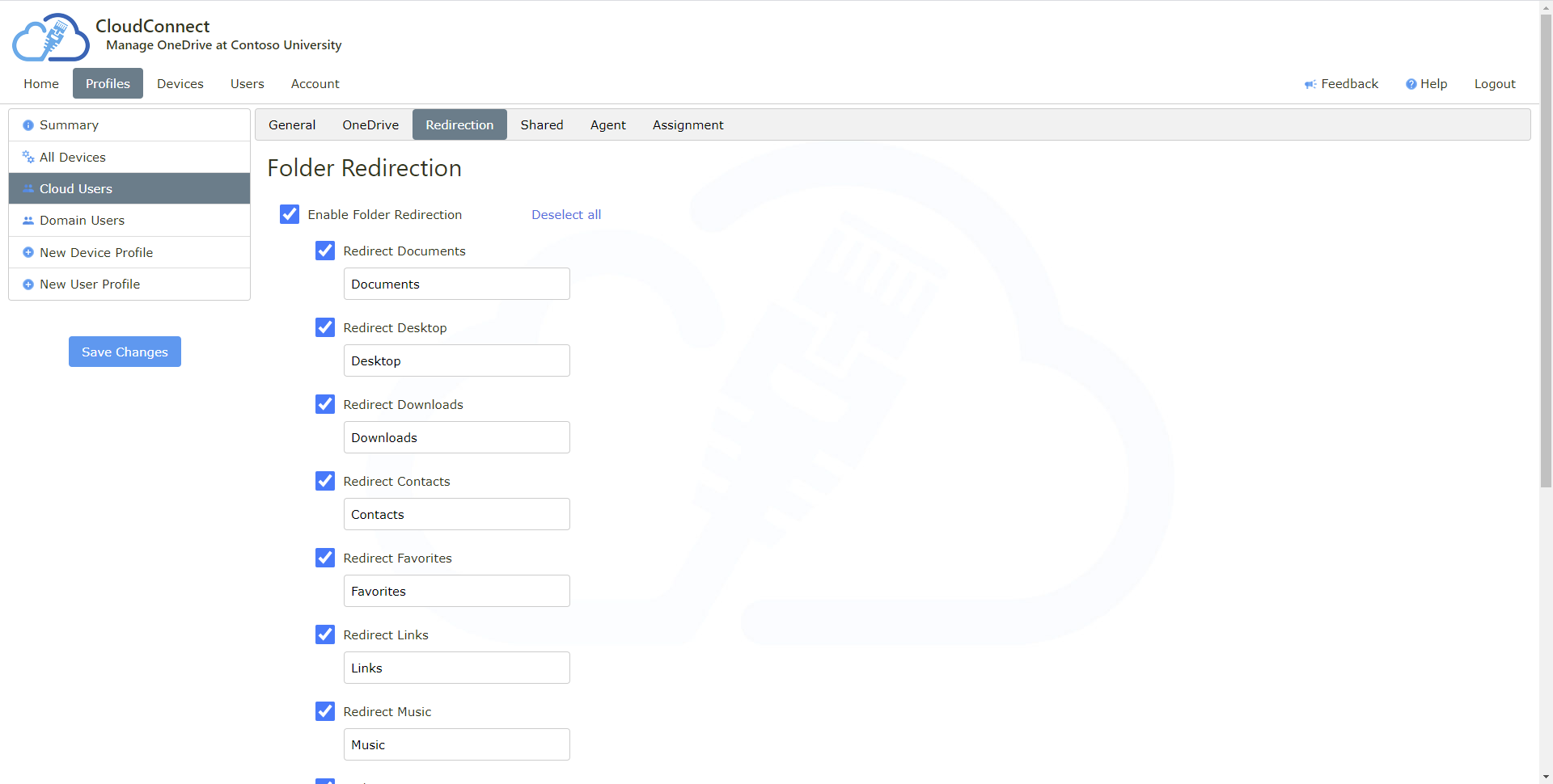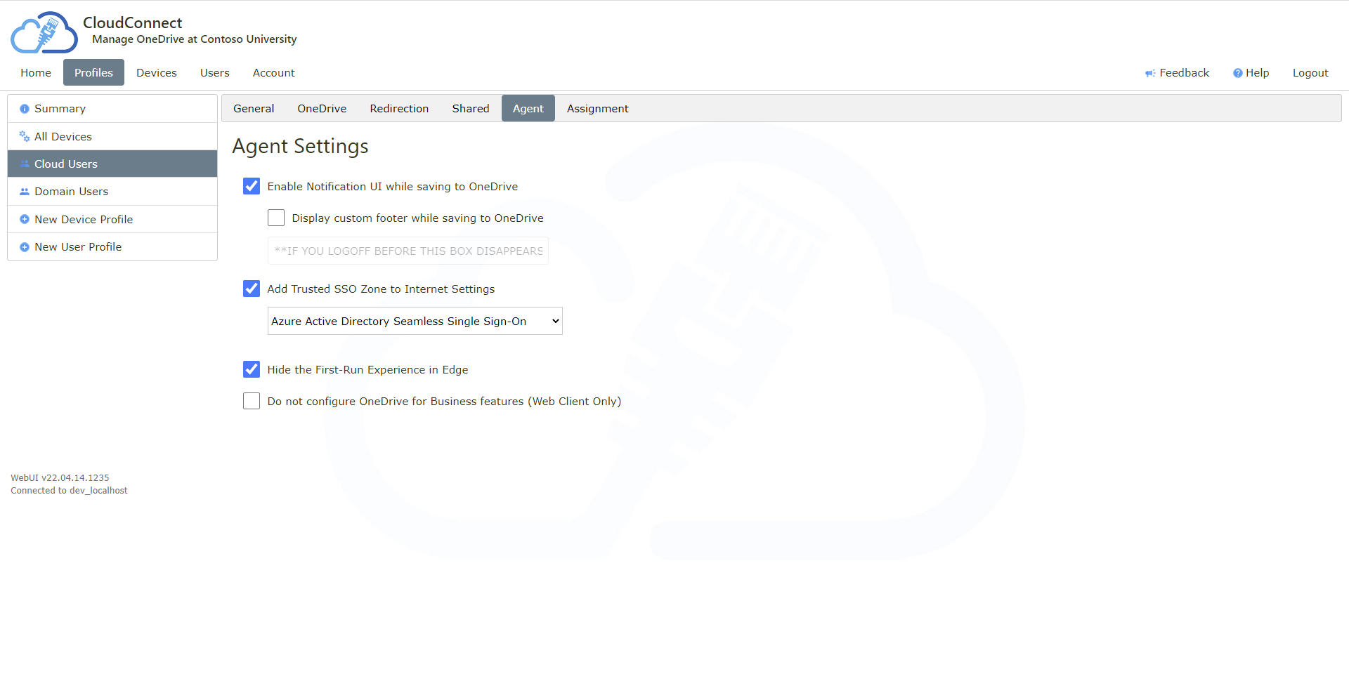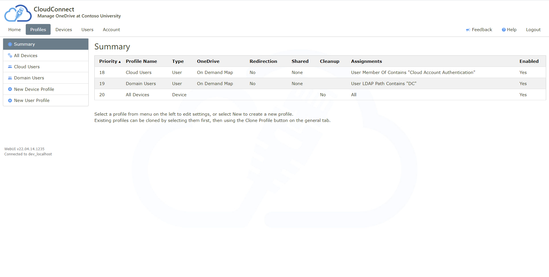 Multiple fully customisable web based configuration profiles assigned to users, groups and specific devices